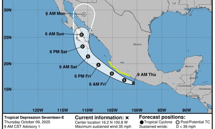Oaxaca de Juárez, Oax. 9 de octubre de 2025.- La Coordinación Estatal de Protección Civil y Gestión de Riesgos (CEPCyGR) exhorta a la población a extremar precauciones ante las lluvias generadas por la depresión tropical Diecisiete-E, ubicada en el Océano Pacífico.