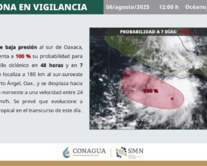 Este fenómeno ocasionará lluvias fuertes a localmente intensas en las regiones Costa, Sierra Sur, Mixteca e Istmo de Tehuantepec Oaxaca de