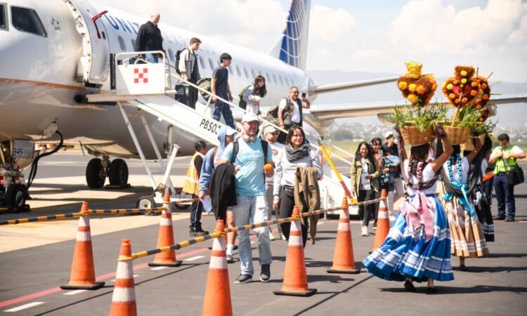 Oaxaca de Juárez, Oax. 31 de octubre de 2025.- Con una muestra cultural de la entidad, la Secretaría de Turismo (Sectur Oaxaca) recibió el vuelo directo de Houston, Texas al Aeropuerto Internacional de Oaxaca, que el pasado 26 de octubre aumentó sus frecuencias.
