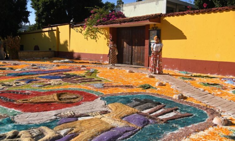 Oaxaca de Juárez, Oax. 27 de octubre de 2025.- Un caudal de colores y símbolos recorre el corazón del Barrio Mágico de Jalatlaco con el tapete monumental “El río que se hizo camino”, creación del artista oaxaqueño Fernando “Beta”, inaugurado por la Secretaría de Turismo (Sectur Oaxaca).