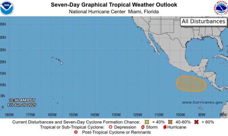 Oaxaca de Juárez, Oax. 20 de junio de 2025.- El Consejo Estatal de Protección Civil informa que, de acuerdo con el Centro Nacional de Huracanes de los Estados Unidos, se ha identificado una zona con potencial ciclónico frente a las costas de Centroamérica y el sur de México.