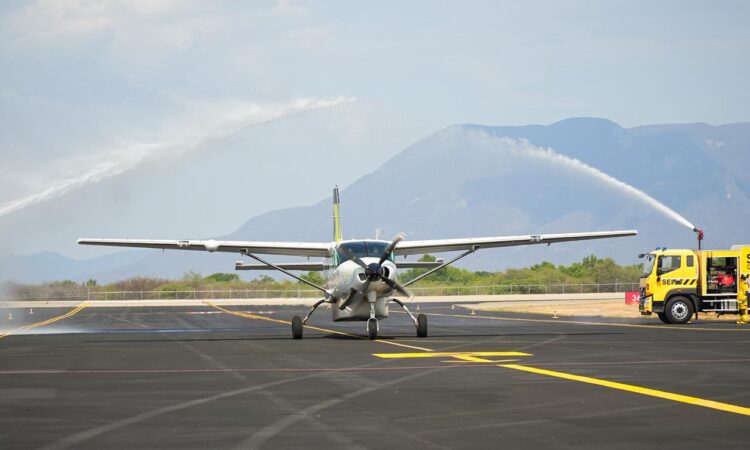 Ciudad Ixtepec, Oax. 20 de abril de 2026.- La Secretaría de Turismo (Sectur Oaxaca), representantes de la aerolínea Fly Aerus y autoridades municipales recibieron este lunes el primer vuelo de la nueva ruta que enlaza a este municipio del Istmo de Tehuantepec con el Aeropuerto Internacional Felipe Ángeles (AIFA), ubicado en Ciudad de México.